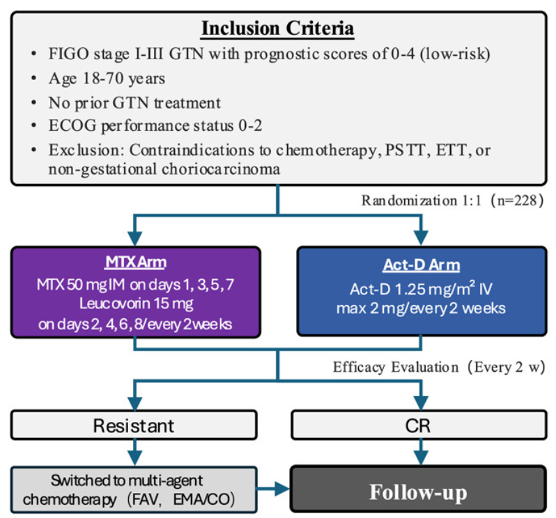 向阳教授团队设计了一项前瞻性、多中心、随机对照试验(NCT04562558),头对头比较了双周单剂量Act-D方案与八天MTX方案在低危GTN患者(FIGO评分0-4分)中的有效性和安全性。2020年9月27日至2024年6月18日,研究共纳入228例FIGO评分0–4分的低危GTN患者,按1:1随机分配至Act-D组和MTX组,分别接受双周单剂量Act-D方案(1.25 mg/m²,单次最大剂量2 mg,每14天重复)和八天MTX方案(MTX于第1、3、5、7天肌注50 mg;亚叶酸钙于第2、4、6、8天15mg;每14天重复),治疗持续至血清β-人绒毛膜促性腺激素(β-hCG)水平恢复正常,其后再给予2-3个周期的巩固化疗。研究主要终点为单药化疗的CR率和总体CR率,总体CR率涵盖了单药治疗失败后二线化疗达到完全缓解数据,CR定义为化疗后β-hCG水平恢复正常至少4周。次要终点包括达到CR的时间、化疗周期数、毒性反应以及抗米勒管激素(AMH)水平的变化(图1)。