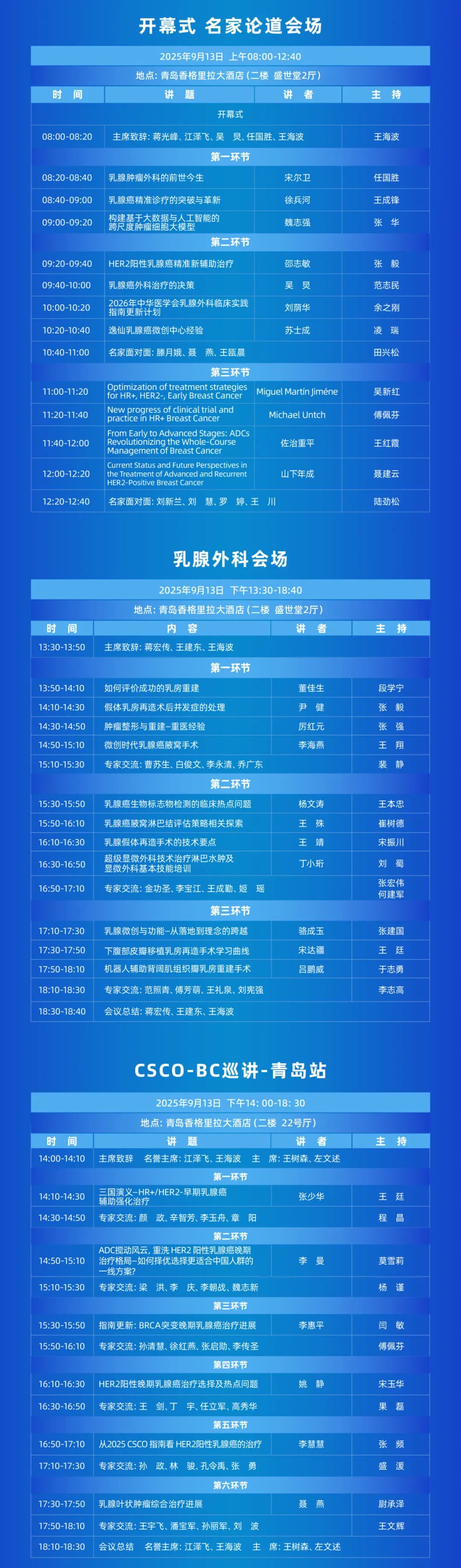 王海波教授:第十一届青岛乳腺疾病大会暨第九届“琅琊论剑”专题会在继承往届名家论道、琅琊论剑等经典板块的基础上,新增了乳腺外科会场、青岛乳房重建培训班等新技术实战培训环节。其中,9月10日(周三)青岛乳房重建培训班的日程聚焦“微创腔镜技术”,我们邀请到四川大学华西医院杜正贵、陆军军医大学第一附属医院(西南医院)唐鹏教授、首都医科大学附属北京朝阳医院王子函教授分别对乳腺癌腔镜技术进行手术演示和理论授课,并邀请中山大学附属第六医院李海燕教授分享“机器人腔镜乳房手术如何起步和晋级”。