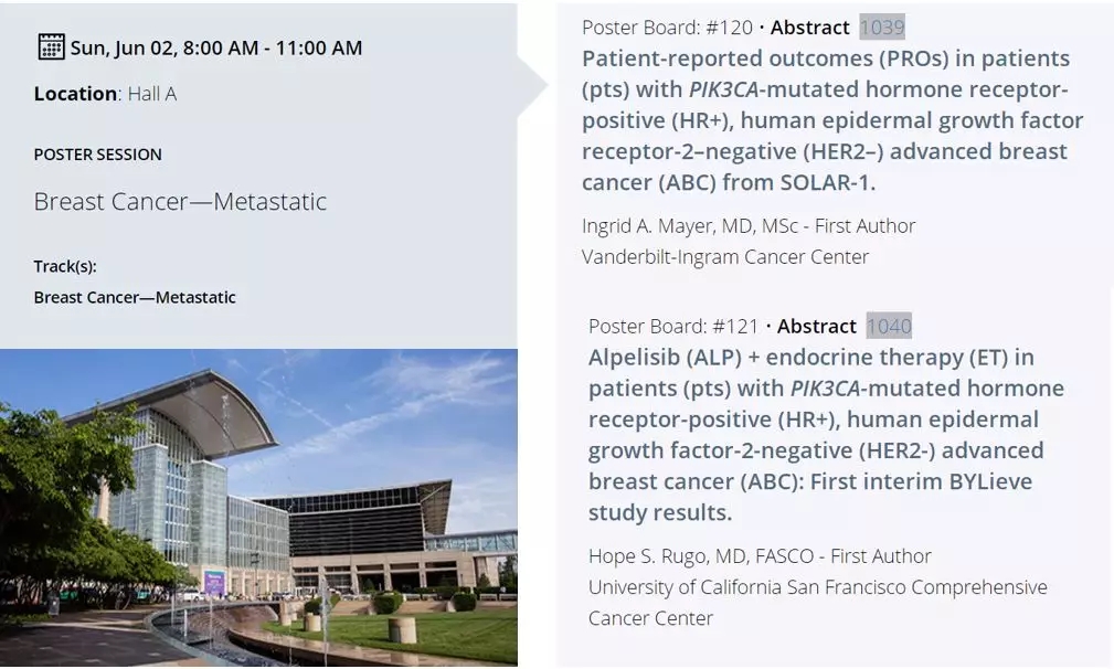 PI3K/Akt/mTOR信号通路活化在乳腺癌内分泌耐药患者十分常见,已成为逆转内分泌耐药的重要靶点。以往PrECOG0102、BOLERO-2研究证实依维莫司(mTOR抑制剂)联合氟维司群可显著延长AI耐药晚期乳腺癌患者的PFS。2019 ASCO大会上则将首次报告两项PI3Kα选择性抑制剂Alpelisib的临床研究——SOLAR-1(摘要号:1039)和BYLieve(摘要号:1040)。