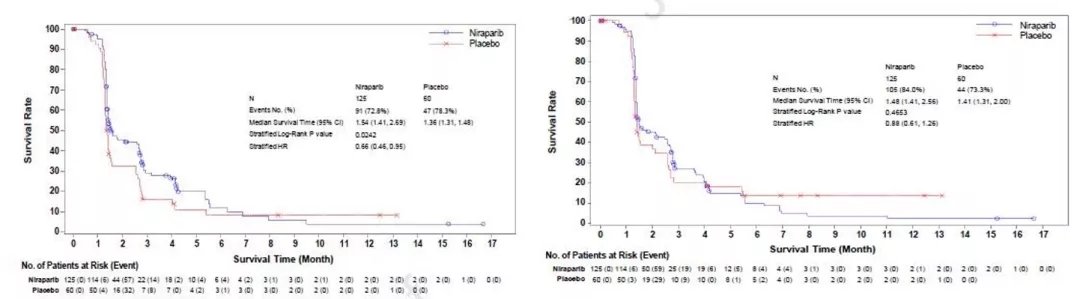 研究预计招募591例患者,由于SCLC一线标准治疗的变革,在入组185例患者后,研究于2020年3月份提前终止。实际272例患者接受筛查,185例患者入组,尼拉帕利组和安慰剂组分别入组125例和60例患者,两组中位随访时间7.7个月和6.6个月。2020年3月数据锁库时,两组分别有11例和7例患者继续接受治疗,基线特点均衡可比,尼拉帕利组和安慰剂组分别有72.8%和78.3%的患者出现疾病进展或死亡。