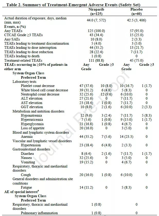 安全性:两组中位暴露时间分别为44天和42.5天,中位治疗强度均为200 mg/d,两组分别有100%和95%的患者出现任何级别的全因治疗相关不良反应。尼拉帕利组和安慰剂组严重不良反应发生率分别为8%和3.3%,3度及以上不良反应发生率分别为34.4%和25.0%,治疗相关的不良反应分别导致4%和5%的患者治疗终止(图3)。