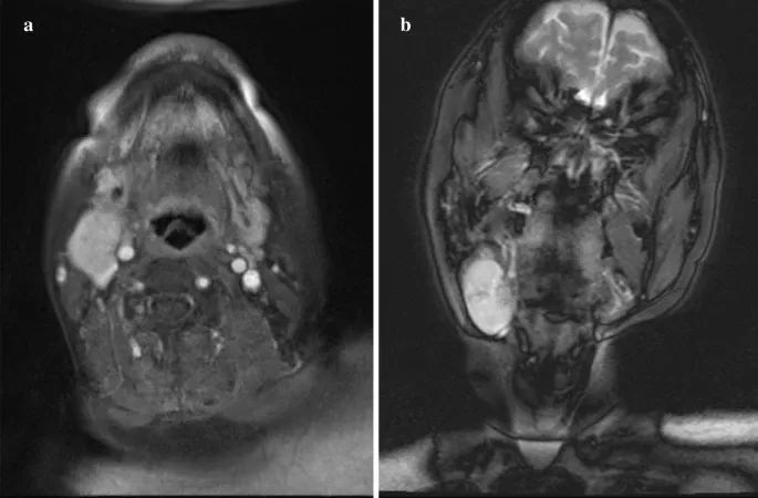 初诊时,右侧下颌下区可触及一个40×30 mm、弹性柔软、可移动的肿块,边界清晰,皮肤颜色健康。无自发性疼痛和压痛。MRI示圆形肿块,边界较清晰,大小为29×24×40 mm,前缘毗邻右侧颌下腺,后深部压迫右侧颈内静脉。边缘很光滑。肿块表现出高信号强度区域,部分伴随为内部的低信号区域。周围组织未见浸润,未见其他明显肿大淋巴结。基于这些发现,强烈怀疑涎腺肿瘤(图1a, b)。