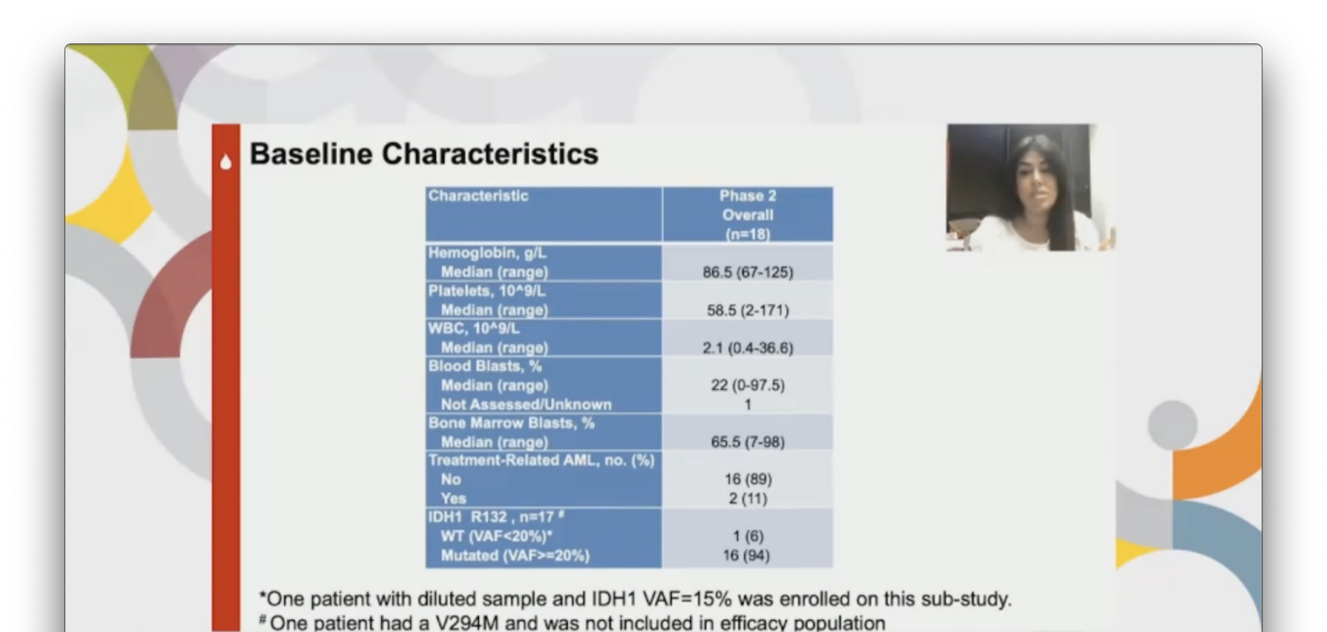 这是一项开放标签的、多中心、单臂II期临床研究,总共入组19例IDH1突变患者,18例采用双药治疗,即连续应用艾伏尼布联合阿扎胞苷的方案治疗六个疗程,前提条件是都达到了一个完全缓解没有疾病进展的证据,没有不可接受的毒性,或者没有进入到造血干细胞移植,经过六个疗程之后,患者达到了CR/CRi。继续同样的方案,一直达到12个疗程,然后再进行艾伏尼布的单药维持到疾病进展。