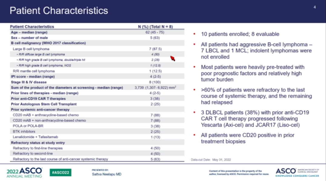 8例患者入组,均为晚期,中位年龄62岁(范围45-75岁),男性5例。大B细胞淋巴瘤7例,其中复发难治的DLBCL 4例,复发难治高级别双打击B细胞淋巴瘤2例,复发难治高级别非特指B细胞淋巴瘤1例。MCL 1例。中位既往治疗线数4(范围2- 5),中位IPI 4(范围2-5)。3名患者之前接受了抗CD19 CAR- T细胞治疗。2例既往做过ASCT。3例用过POLA治疗,2例用过BTK抑制剂治疗。一线难治4例,二线难治4例。3例用DL1治疗,3例用DL2治疗,2例用DL3治疗。