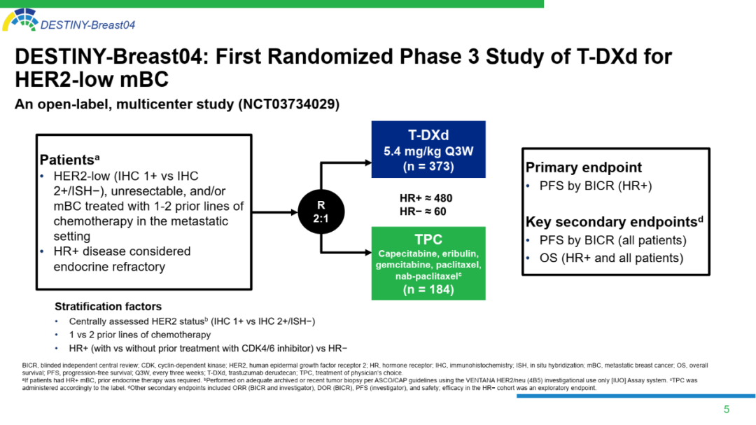 DESTINY-Breast04是一项随机对照、开放、全球多中心的III期临床研究,探索了T-DXd在HER2低表达乳腺癌患者中的疗效及安全性。该研究计划入组540例(480例HR阳性和60例HR阴性)HER2 IHC1+或IHC2+/FISH-,未接受过HER2靶向治疗或既往转移阶段接受过1-2线化疗方案或HR+至少接受1种内分泌治疗后进展且不能从进一步内分泌治疗中获益的HER2低表达晚期乳腺癌患者,按照2:1比例随机分为T-DXd(5.4 mg/kg,每3周静脉注射一次)治疗(n=360例)和医生选择的化疗(卡培他滨、艾立布林、吉西他滨、紫杉醇或白蛋白紫杉醇)组(n=180例)。主要研究终点是独立评审委员会(BICR)评估的HR+人群的PFS,次要研究终点是研究者评估的HR+人群的PFS、OS、ORR、无论HR状态的DoR,以及安全性和耐受性等。分层因素:1)中心评估的HER2状态(IHC 1+vs IHC 2+);2)既往化疗(1线vs 2线);3)HR+(有或无CDK4/6抑制剂既往治疗)vs HR-。