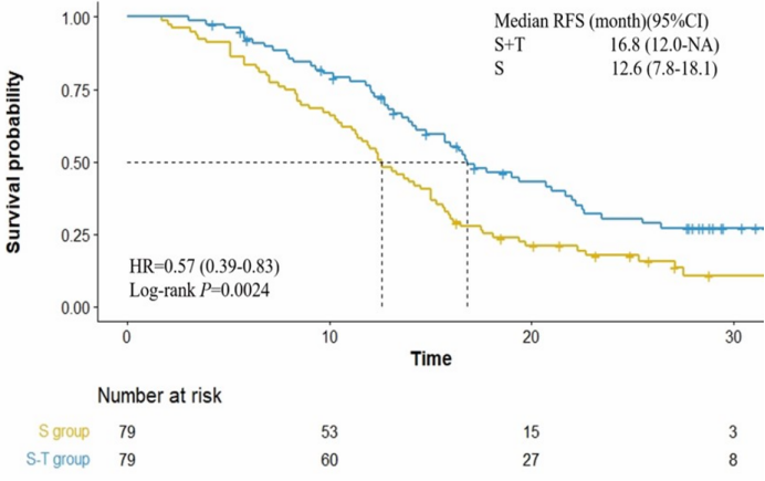 SOR-TACE组的中位RFS为16.8个月,显著长于索拉非尼组的12.6个月(HR=0.57,Log-rank P=0.0024)(图2)。