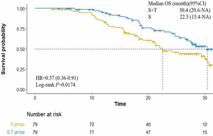 SOR-TACE组的中位OS为30.4个月,也显著长于索拉非尼组的22.5个月(HR=0.57,Log-rank P=0.0174)(图3)。