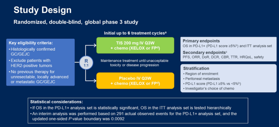 2.Moehler MH,Kato K,Arkenau H-T,et al.Rationale 305:phase 3 study of tislelizumab plus chemotherapy vs placebo plus chemotherapy as first-line treatment(1L)of advanced gastric or gastroesophageal junction adenocarcinoma(GC/GEJ).J Clin Oncol.2023;41(suppl 4):286.doi:10.1200/JCO.2023.41.4_suppl.286