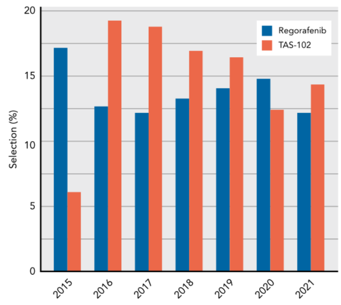 图1.随着时间的推移,瑞戈非尼和TAS-102作为三线或三线以上在转移性结直肠癌患者中使用占比的趋势