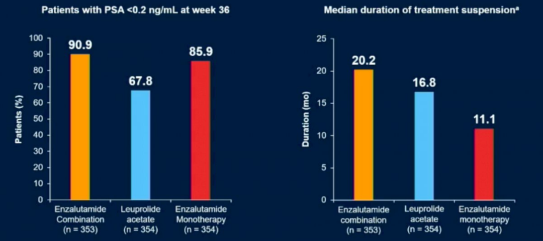 恩扎卢胺联合组、亮丙瑞林组、恩扎卢胺组36周时PSA<0.2 ng/mL的患者比例分别为90.0%、67.8%和85.9%,中位治疗暂停时间分别为20.2个月、16.8个月和11.1个月。可见恩扎卢胺联合组有更高比例的PSA控制以及更长时间的停药。