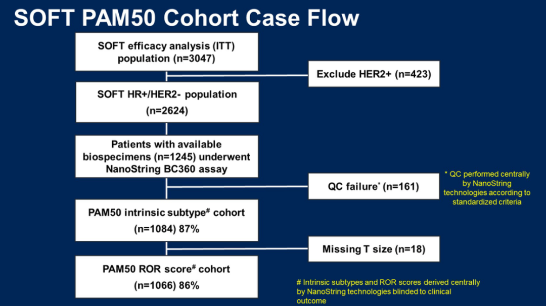 本次ASCO大会上报道了SOFT试验的二次分析结果——绝经前HR+/HER2-乳腺癌女性的PAM50内在亚型和ROR评分对于不同年龄段的年轻乳腺癌的预后价值和复发风险预测能力。SOFT是针对绝经前HR+/HER2-辅助内分泌治疗的一项研究,研究结果提示,与他莫昔芬单药辅助治疗相比,在他莫昔芬(T+OFS)或依西美坦(E+OFS)辅助内分泌治疗的基础上加用卵巢功能抑制(OFS)可降低复发风险。SOFT试验二次分析评估了PAM50亚型和ROR评分在一部分患者中的应用价值。