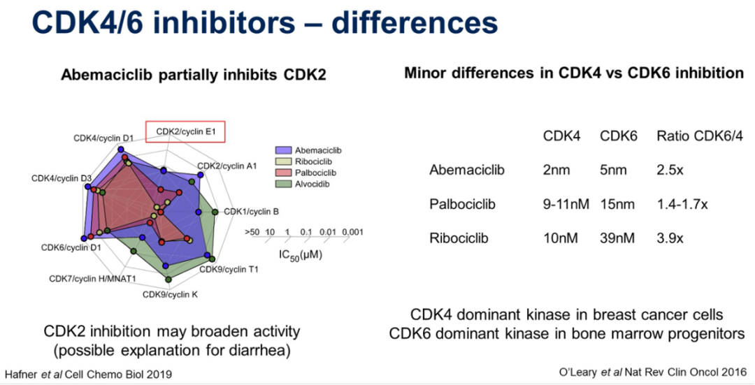虽然目前三种CDK4/6抑制剂尚无头对头的研究,不能通过跨试验比较得出疗效存在差异,但已经有基础研究结果表明不同CDK4/6抑制剂在药物作用机制上还是有所差异的,例如既往研究显示不同的CDK4/6抑制剂对CDK4和6的抑制效力是不同的,CDK4主要抑制乳腺癌细胞增殖,CDK6主要抑制骨髓细胞,增加血液学毒性。因此,不同的CDK4/6抑制剂药理上的不同是否会带来疗效和安全性上的差异,需要更多的研究证据。