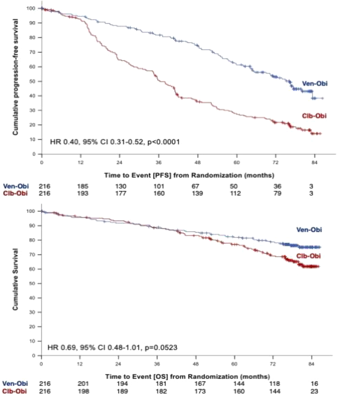 Ven-Obi组报告了48例死亡(9例与疾病进展相关),Clb-Obi组报告了70例死亡(26例与疾病进展有关);Ven-Obi和Clb-Obi组6年OS率分别为78.7%和69.2%[HR 0.69(0.48~1.01),P=0.052]。Ven-Obi和Clb-Obi组分别有30例和18例报告了第二原发性恶性肿瘤;随机化后6年的累积发病率分别为14.2%和8.5%(P=0.071)。未观察到新的安全信号。
