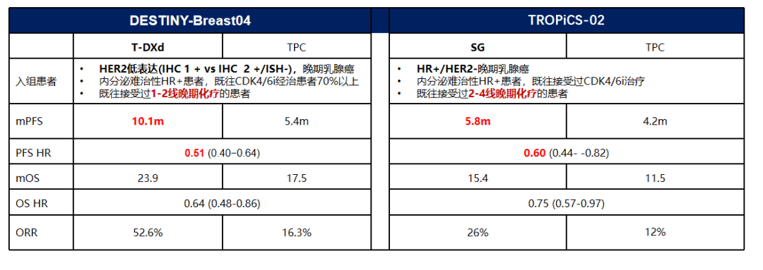 DB-04、TROPiCS-02两项研究都取得了有“统计学意义”的PFS和OS改善,但后者的延长幅度以及HR降低程度均较小,能否达到有“临床意义”的生存改善仍有待在实践中确认。“统计学意义”在于客观数据呈现的统计学改善趋势,“临床意义”则需通过观察实际治疗效果(包括HR和置信区间等)来判断。