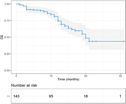 患者的中位OS为20个月(95%CI:19~31)。18个月时,OS率为59%。T-DXd一线/二线治疗患者的12个月OS率高于T-DXd后线治疗患者(89%vs.73%;HR 1.63,95%CI:0.58~4.03,P=0.39)。