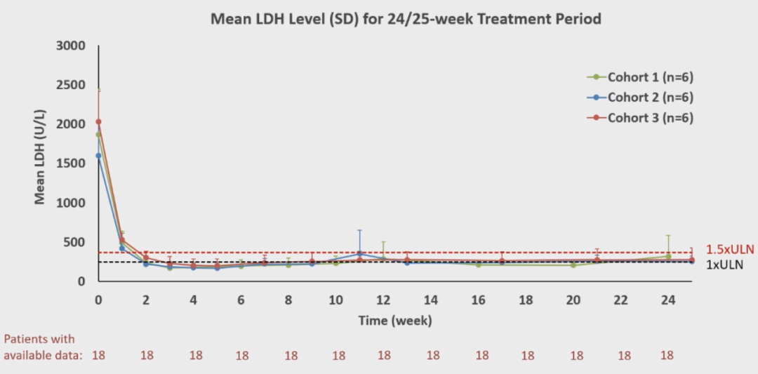 患者显示LDH水平迅速下降并持续控制:在24/25周,83%(15/18)患者的LDH水平持续低于1.5×ULN,72%(13/18)患者的LDH水平维持在1×ULN以下(图4)。