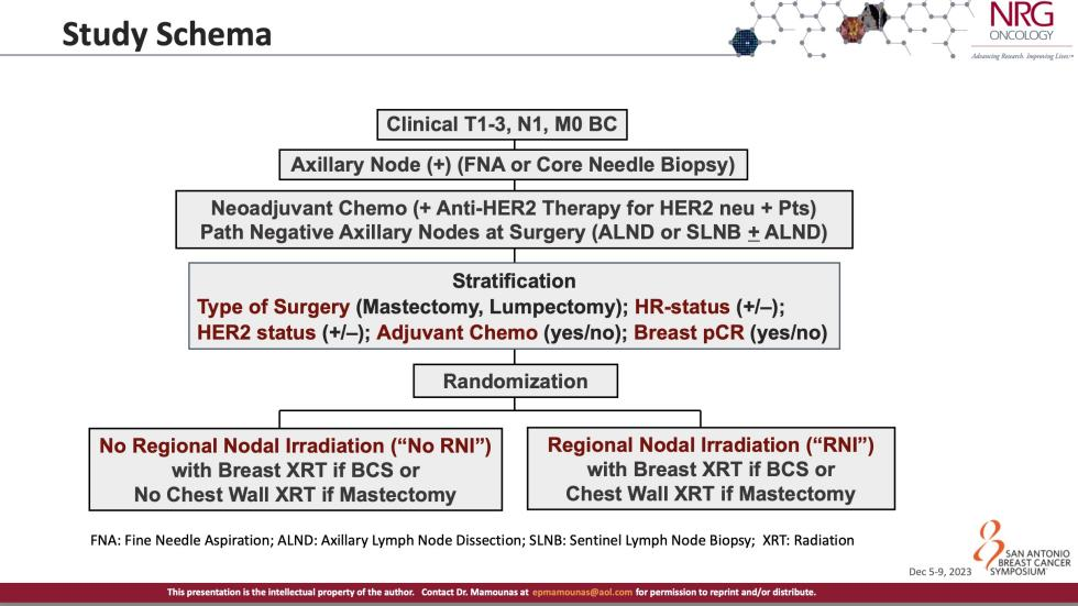 NSABP B-51试验入组了NAC前cT1-3N1M0、NAC后经前哨淋巴结活检(SLNB)或ALND后判断为ypN0的患者,并对其进行随机分组,如果采用保乳治疗,则随机分配到全乳放疗组和全乳+区域淋巴结放疗(RNI)组;如果患者采用全乳房切除手术,则随机分为乳房切除术后放疗(PMRT)+RNI组和无术后放疗组。NSABP B-51试验主要研究终点无浸润性乳腺癌复发间期(IBC-RFI),次要终点包括无局部复发间期(LRRFI)、无远处复发间期(DRFI)、无病生存期(DFS)和总生存期(OS)。