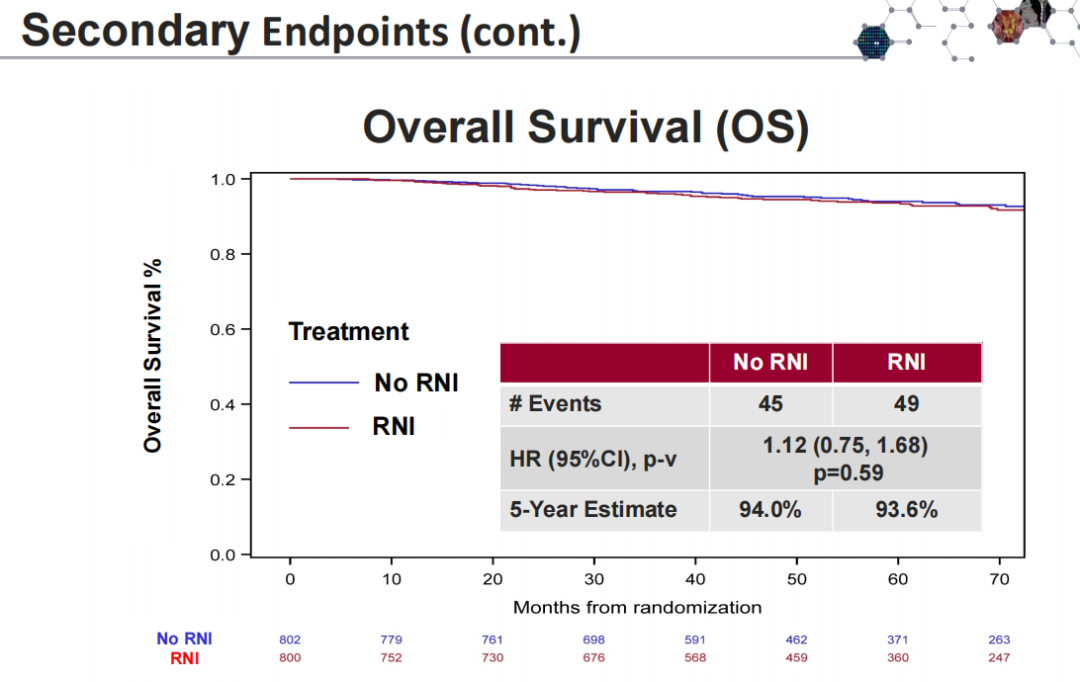 在该研究中ypN0是通过SLNB和ALND两种方式来进行评估的,而SLNB这部分患者至少会有10%的假阴性率。即便如此,我们也可以因此得到一个结论,cN1、NAC后达到ypN0的患者,肿瘤负荷较轻,在腋窝的局部治疗上有做减法的机会。此外,在乳房切除的亚组中可以看到,放疗的加入使患者的局部复发有降低的趋势,但没有统计学意义。另外我特别关心的一个亚组是接受了乳房切除和SLNB,但未行ALND的患者,RNI与否是否有区域复发的差异。但本次大会并未公布相关研究结果,期待全文发表能获得这部分患者的信息。