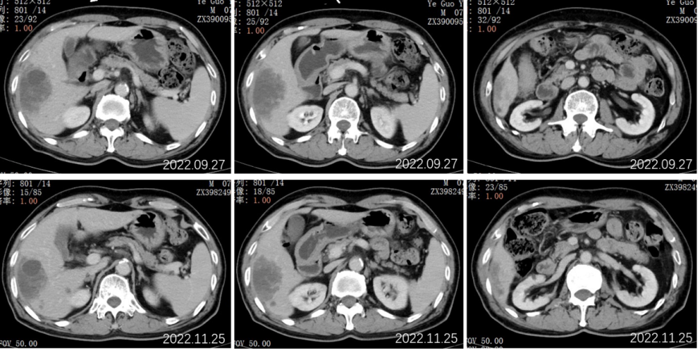 2022.07.19行全腹部平扫+增强:肝右叶可见一类圆形稍低密度影,累及肝S5-8段,边界欠清,约80mm*50mm*98mm大小,密度欠均匀,增强动脉期病灶边缘轻度强化,门脉期边缘环状强化更为明显,中心见无强化坏死区,病灶周围S6段另见数个小结节样类似强化灶;肝内另见数个类圆形低密度灶,径约7-25mm,增强扫描未见强化。